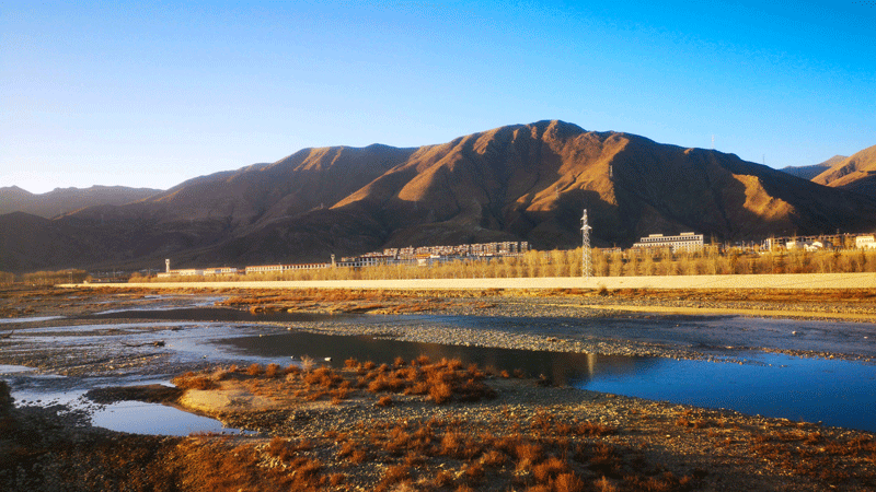 高速公路被两边连绵不绝的山峦裹夹着奔向远方,车子朝着正确的方向前进,拉萨河缓缓流过,土地宽广,既荒凉又美好。