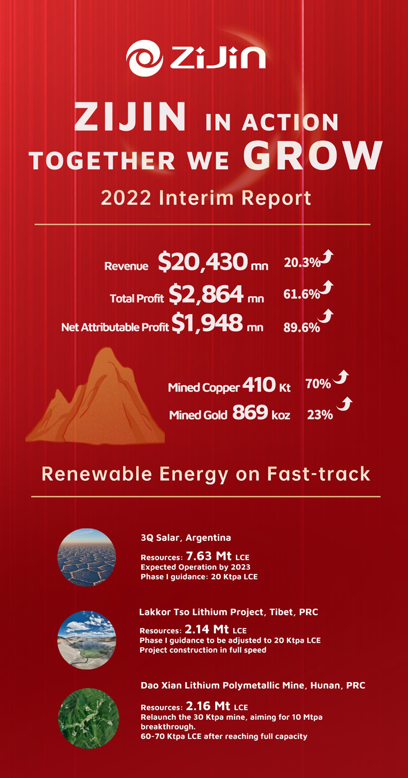 In the second half of the year, Zijin will seize market opportunities and strive to deliver on its 2022 performance targets, based on the overarching principle of “deepening reform, leapfrog growth and sustainable development”. It will seek to unlock the potential of existing projects, speed up the construction of key projects and ensure they are commissioned and generate profits as early as possible.