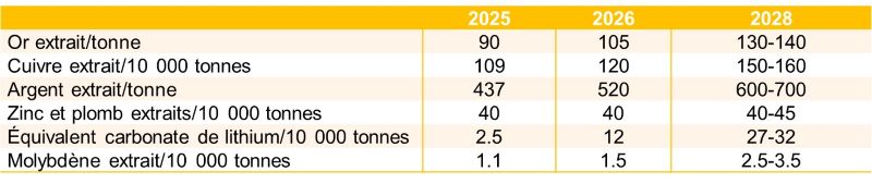 La croissance de la production restera soutenue, selon le nouveau plan de Zijin. À l’horizon 2028, ses volumes de métaux extraits devraient atteindre :