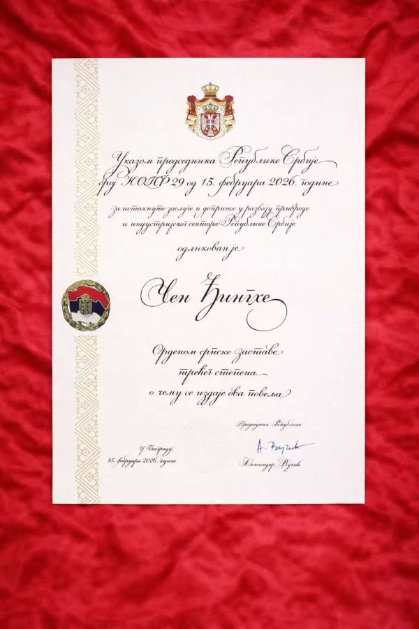 16 février — À l'occasion de la Journée de l'État serbe, M. Chen Jinghe, fondateur et président honoraire à vie de Zijin Mining, a reçu l'Ordre du Drapeau serbe des mains du président Aleksandar Vučić. Cette distinction, l'une des plus prestigieuses du pays pour les citoyens étrangers, récompense la contribution significative de M. Chen au développement industriel de la Serbie.